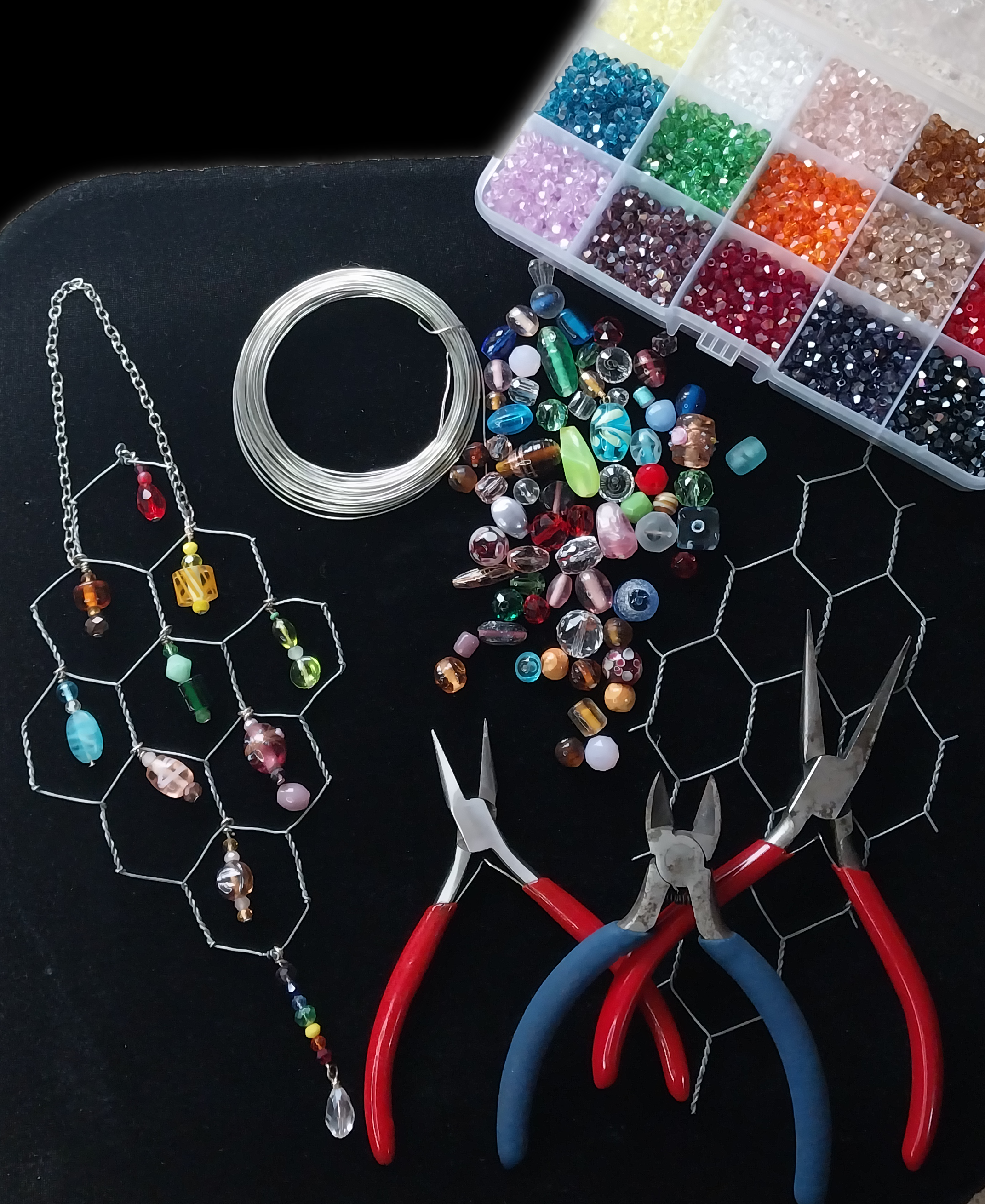 Description: Create a boho-inspired suncatcher using glass beads, wire, and a chicken wire base. In this hands-on class, you’ll learn wire and beading basics, including how to make headpins, create secure loops, and attach beads using pliers. Students will work with glass beads of various sizes and add chain remnants for hanging, resulting in a one-of-a-kind suncatcher that catches the light beautifully.